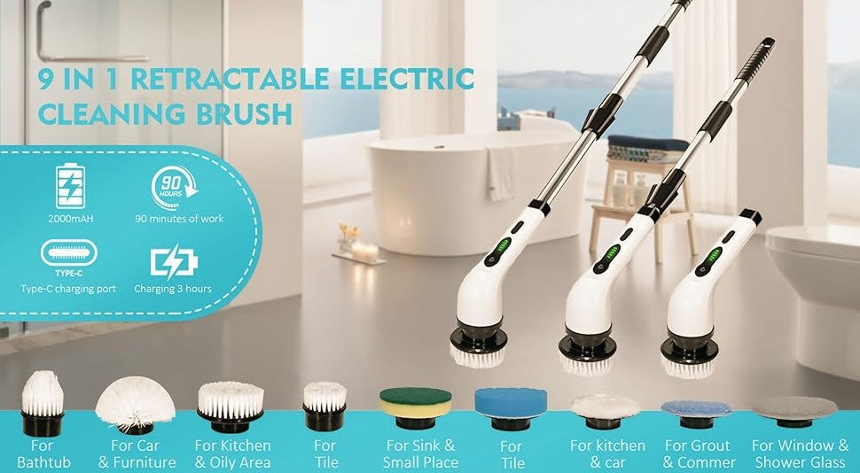 9 Interchangeable Brush Heads: Includes flat, round, sponge, scouring pad, and corner brushes for versatile cleaning.